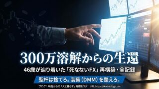 46歳からの挑戦ログ(FX手法など) 【保存版】FXの死因を全解剖。生存率を上げる「鑑識」レポート 【保存版】FXの死因(負けパターン)を全解剖。10件の凄惨なロスカット現場検証から導き出した「生存への鉄則」を捜査班長コリンが報告する。お前が負けるのは運じゃない、装備不足だ。DMM FX PLUS(プレミアチャート・IFO注文)を駆使した「鑑識トレード」で、9割の退場者になるな。 2026.02.12 46歳からの挑戦ログ(FX手法など)