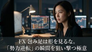 FXの包み足(エンゴルフィング)はただのサインじゃない。オセロのように勢力図が一気にひっくり返る「全否定」の瞬間だ。レンジのダマシを回避し、トレンド転換の初動を狙い撃つための3つの鉄板ルーティンと、一瞬のチャンスを逃さないトレード環境を公開。