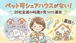 愛犬との引越し記録 ペット可シェアハウスがない!20社全滅の46歳が見つけた裏技 ペット可シェアハウスがない!オークハウスなど20社調査の結果は全滅。絶望した46歳が見つけた「家具レンタル×格安賃貸」という裏技とは?初期費用を抑えて愛犬と暮らす、シェアハウスより賢い解決策を公開します。 2025.12.09 愛犬との引越し記録
