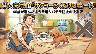 賃貸暮らしの工夫 賃貸の床対策は「サンコーおくだけ吸着」一択!46歳が選んだ退去費用&パテラ防止の決定版 賃貸で犬を飼うなら床対策は必須!退去費用の高額請求や愛犬のパテラを防ぐため、46歳の私が実際に選んだのは「サンコーおくだけ吸着」でした。置くだけでズレない・洗える・ドアに引っかからない神アイテムを、デメリットも含めて実体験レビューします。 2025.12.12 賃貸暮らしの工夫
