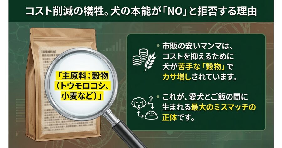 市販の安いマンマはコストを抑えるためにな、 犬が苦手な「穀物」でカサ増しされていることが多いんよ。