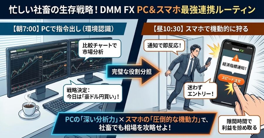 ワシがやっとる、DMMの「PC環境」と「スマホアプリ」を完璧に連携させた1日のルーティンを教えてやる。