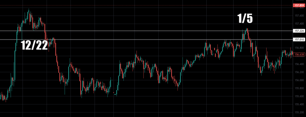 157.30円まで上げた価格は、結局売り圧力に負けて、156.35円まで押し戻されて終わった。 これは明確な「拒絶」だ。