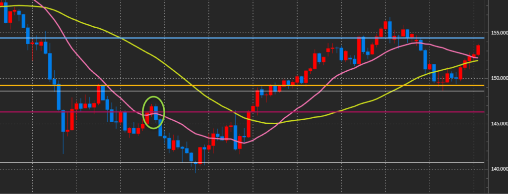 その直後、レートがピタッと止まり、ジリジリと逆行を始める。